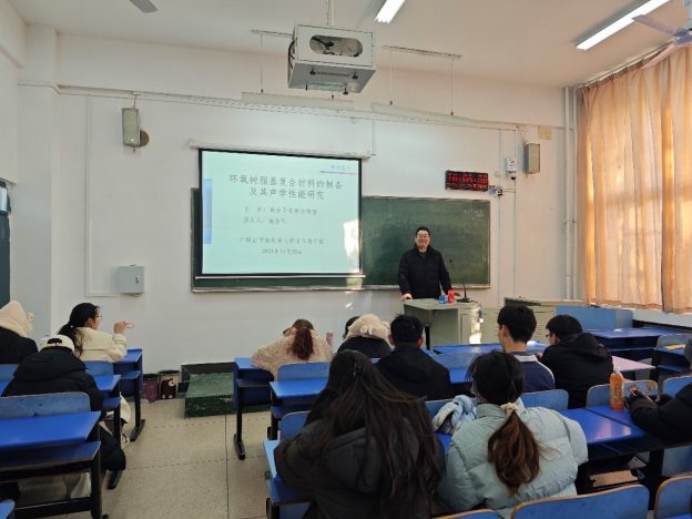 2024年11月28日下午16时,beat365唯一官方网站施雪军博士在4号教学楼4203教室举办了学术讲座,报告题目为《环氧树脂基复合材料的制备及其声学性能研究》,我院22级材料科学与工程专业的学生聆听了本次报告。