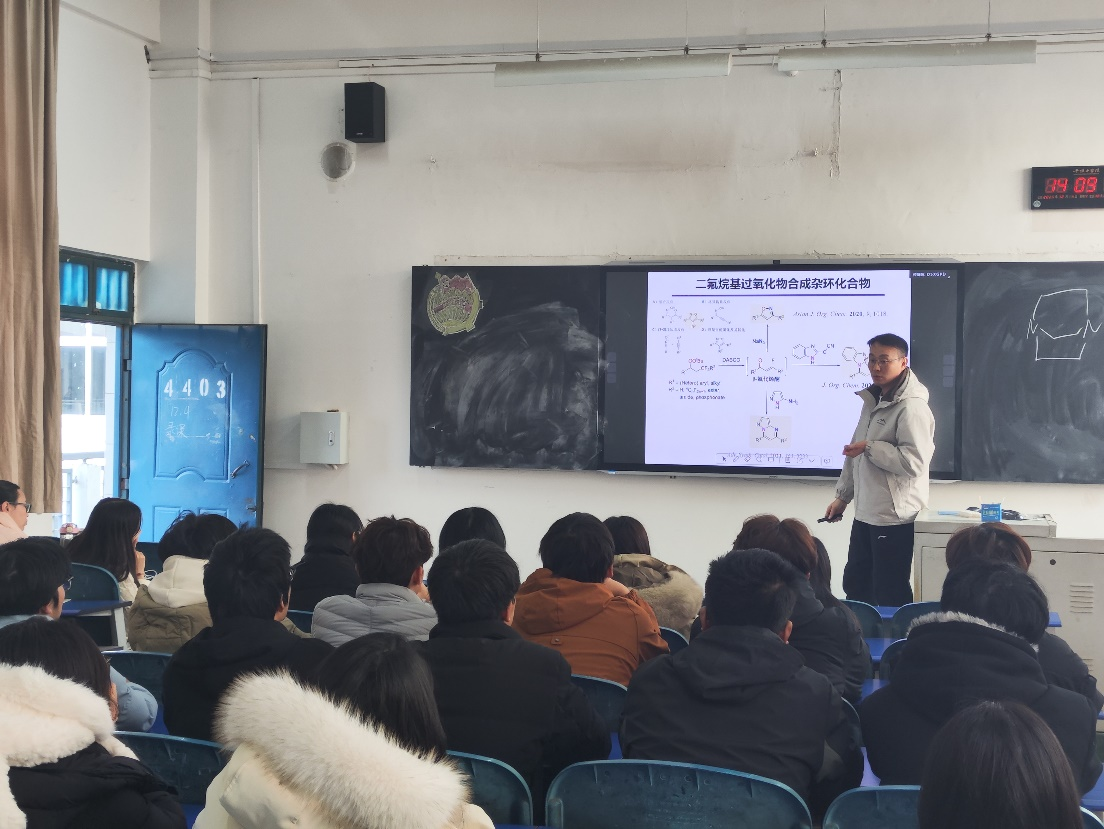 2025年12月4日14:00-14:30,马洋洋博士在4号教学楼4403教室为beat365唯一官方网站2024级化学专业学子带来了一场主题为“二氟烷基过氧化合物的合成及应用”的学术讲座。