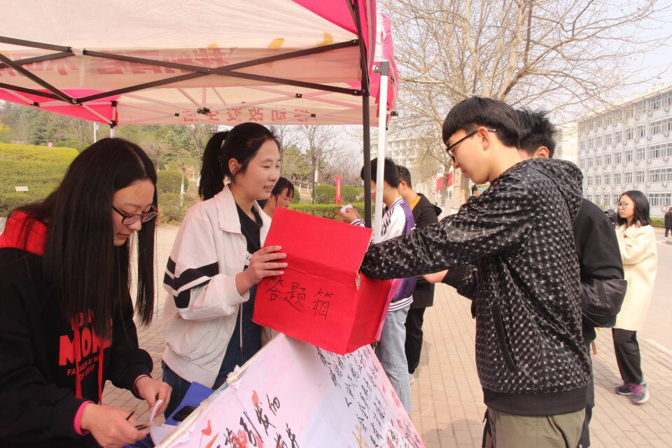 活动开始前,工作人员进行了一系列准备工作。上午九点,参与活动宣传的同学们在扇形广场发放传单宣传“世界防治结核病日”,并进行适当的讲解和说明,向同学们普及防治肺结核的知识,加深同学们对肺结核的产生及预防的认识,消除大家对肺结核病人的偏见。路过的同学们积极参与。随着参与同学人数的增加,工作人员组织同学们参与答题活动。同学们兴致勃勃,积极参与答题活动。参与答题的同学们回答问题正确后现场即得一份精美小礼品。活动持续了两个小时左右,在同学们的大力宣传与积极参与下,预防肺结核宣传活动圆满完成。最后参与活动的同学们在“预防结核从我做起”的条幅上签下自己的名字。