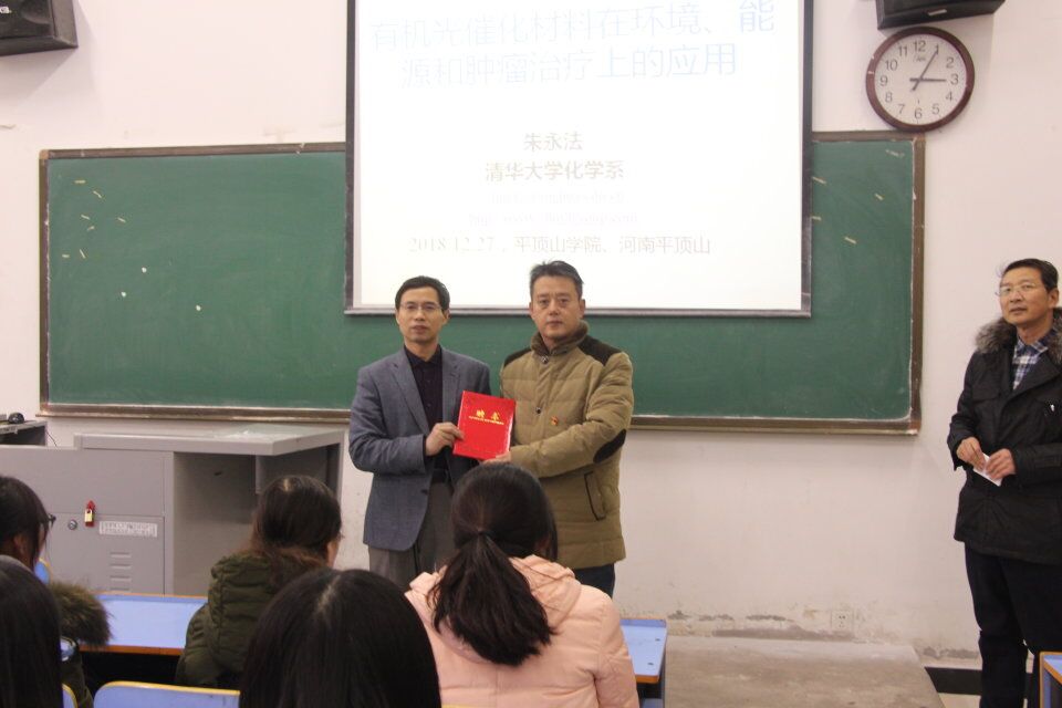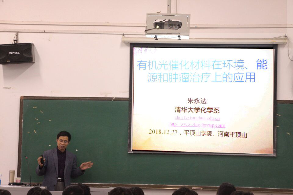 聘任仪式结束后,朱永法教授做了“有机光催化材料在环境、能源和肿瘤治疗上的应用”的学术报告,beat365唯一官方网站教师及材料科学与工程专业学生听取了报告。朱永法教授介绍了氨基取代的PDI超分子光催化材料的应用、红光激发光催化活性机理、TCNQ-PDI相互作用、P25与PDI的复合结构、PDI与石墨烯的π-π作用、超分子组装纳米片结构、光催化在肿瘤快速杀灭上的应用探索等方面的研究成果。报告引起了在场师生的极大兴趣,朱教授也热情严谨地回答了同学们感兴趣的问题。