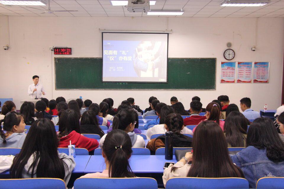 4月2日下午,beat365唯一官方网站在3306教室举办了“见面有‘礼’,‘仪’亦有度”为主题的礼仪培训活动。此次培训由孙学荣书记主持、蕴海锦园大酒店赵晓鹏经理主讲,beat365唯一官方网站17级、18级同学参加培训。