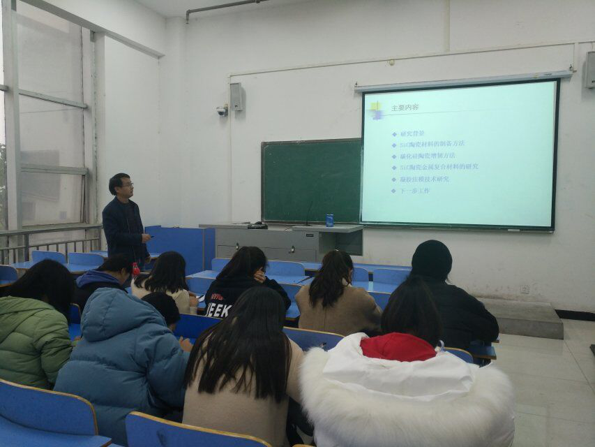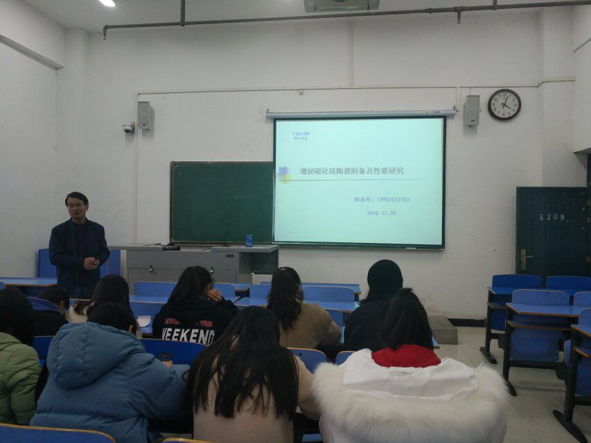 11月29日下午,beat365唯一官方网站韩永军博士在L209进行了关于“增韧碳化硅陶瓷制备及性能研究”的学术报告。beat365唯一官方网站18级化学1班、材料2班全体同学听取了此次学术报告。