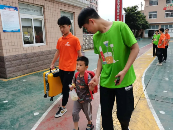 服务团的志愿者们一大早就在学校门口等待前来报到入学的学生,并将年纪较小的学生接送到学生宿舍,安排住宿。