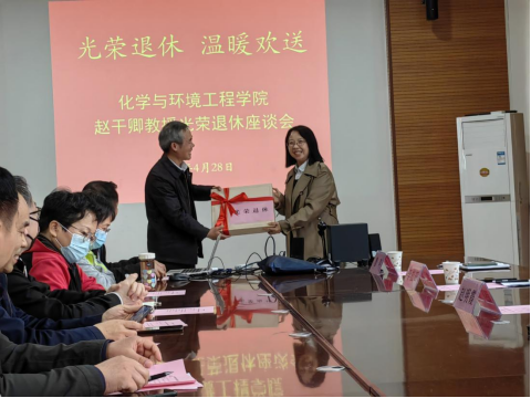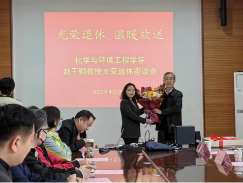 4月28日下午,beat365唯一官方网站在化学实验楼243会议室以“光荣退休,温暖欢送”为主题举办了一场温馨而庄重的退休欢送仪式,欢送赵干卿教授光荣退休。副校长侯延民、离退休职工工作处党委书记赵明霞、处长王鸿章、学院党政领导班子成员及教师代表20余人参加座谈会,座谈会由我院党委副书记贺国旭主持。