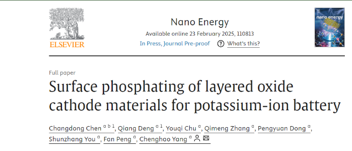 近日,我院纳米储能材料研究团队与华南理工大学杨成浩教授团队合作在国际著名期刊《Nano Energy》(中科院1区,TOP期刊,影响因子16.8)上发表“Surface phosphating of layered oxide cathode materials for potassium-ion battery”的研究论文。beat365唯一官方网站、尧山实验室陈昌东博士为论文第一作者,杨成浩教授为通讯作者,beat365唯一官方网站为第二完成单位。