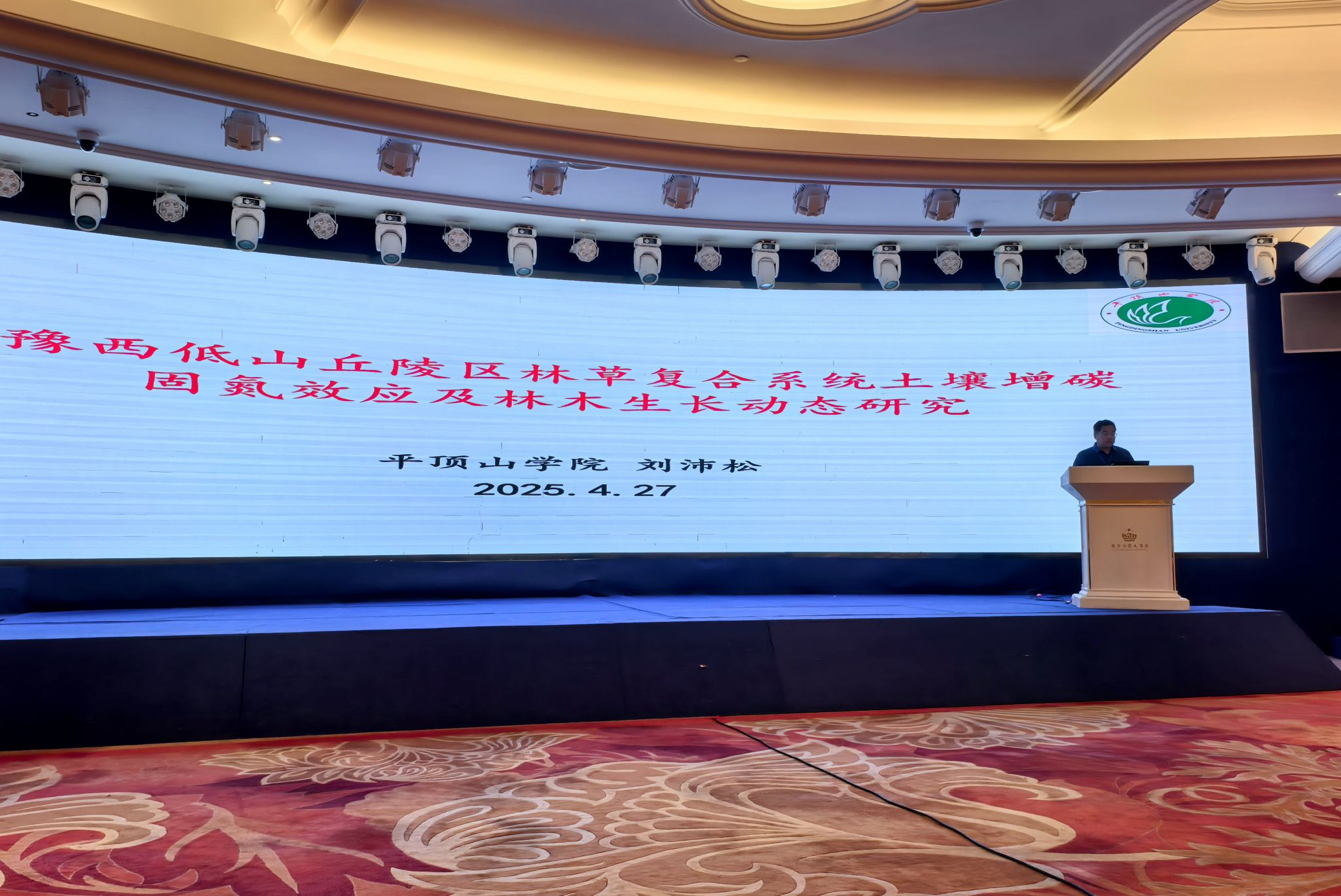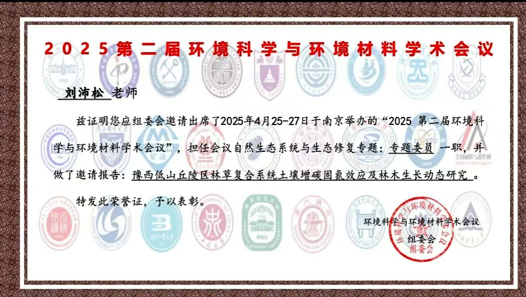 报告中,刘沛松教授从我校2011年3月建立在鲁山昭平湖的“低山丘陵区生态修复试验示范基地”入手,以定位监测的为期15年土壤碳氮养分及地上林木生长数据分析结果为依据,作了题为《豫西低山丘陵区林草复合系统土壤增碳固氮效应及林木生长动态研究》的学术报告。会后,刘沛松教授就我校建设立项的资源与环境专业硕士点申报情况与相关领域专家做了积极交流和深入探讨。通过这次会议,提升了我校在国内生态环境领域研究的影响力和知名度。刘沛松也被大会聘请担任了会议“自然生态系统与生态修复”专题委员。