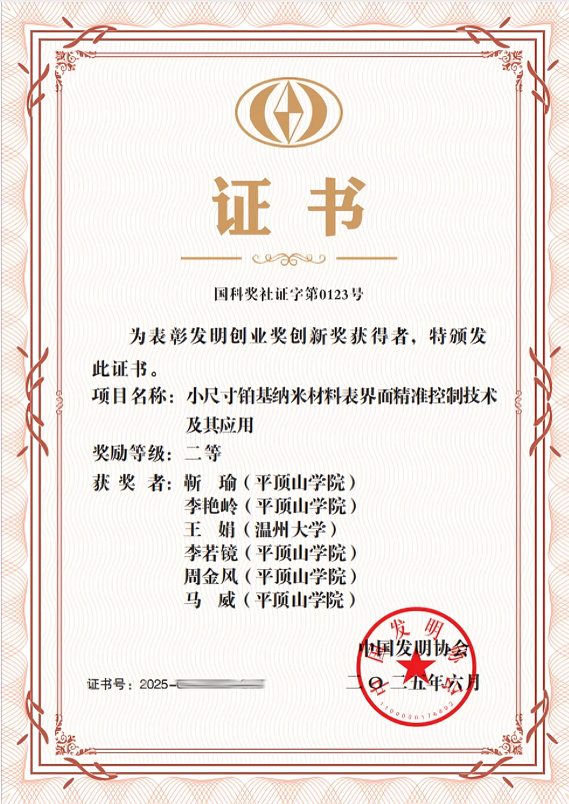 近日,中国发明协会公布了2025年度发明创业奖创新奖的获奖名单。由我院组织、材料科学与工程专业靳瑜博士作为第一完成人牵头申报的“小尺寸铂基纳米材料表界面精准控制技术及其应用”项目,荣获中国发明创业奖创新奖二等奖。该项目由我院科研团队与温州大学共同完成,我校为第一完成单位。