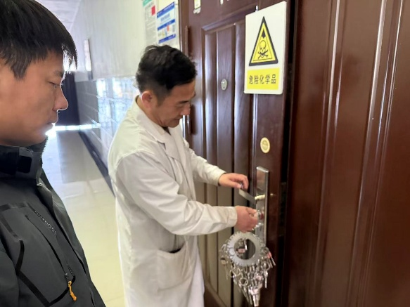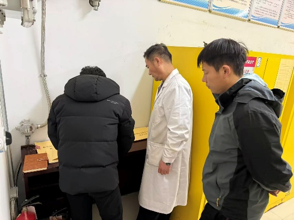 此次专项安全检查活动由学院副院长李伟利带队,实验室主任王敏杰及全体实验管理人员参加,检查对象包括基础教学实验室和科研研究室,检查内容全面涵盖了危险化学品管理、实验设备运行状态、消防设施日期更新、紧急喷淋以及环境卫生等多个方面。李院长现场指挥,仔细查看了各实验室的安全记录,详细询问了实验课程的准备情况,并对存在的安全隐患进行了现场排查,对检查出来的问题,提出解决方案,并要求限时整改。其中,重点对危化品库进行仔细排查,特别强调了专用储存设施的配置标准和双人双锁、台账登记等管理规范,确保危化品储存环节全程可控。在检查过程中,检查人员各司其职,认真负责,对发现的问题做好记录。