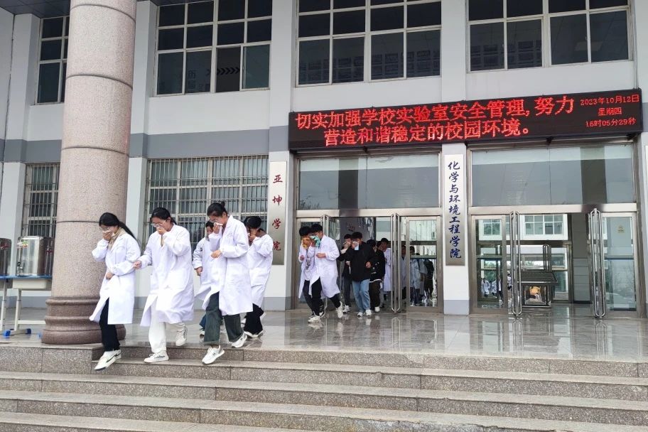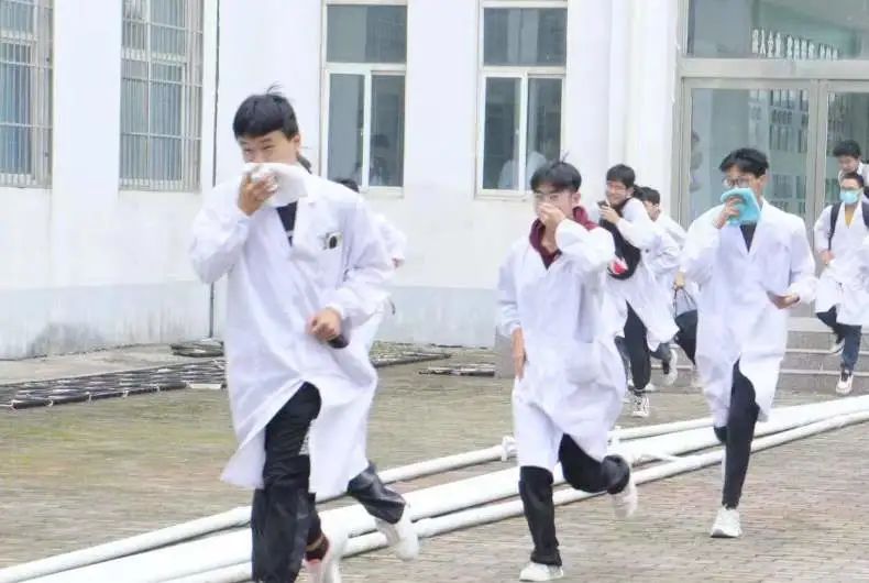 最后,参会师生在化学楼进行火灾疏散演练,模拟接到火灾警报后,学生快速安全疏散的场景。在演练过程中,学生用湿润毛巾紧捂口鼻,俯身低头,沿安全通道快速而有序地疏散到楼外安全地带,演练圆满成功。