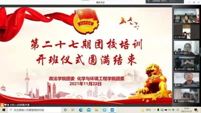 为进一步提升青年团员的理论素养、实践能力和综合素质,2021年11月23日,我院与政法学院通过线上形式联合举行了第二十七期团课培训开班仪式暨第一讲团课培训。政法学院团委副书记马延明、辅导员刘盈君、我院团委副书记史小倩、党政办公室副主任李朝鹏出席了开班仪式,来自两个学院的177名青年团员参加了此次培训活动。