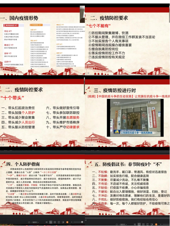 活动中,首先向学生党员们通报了全国疫情形势,掌握了全国中高风险地区的分布及官方发布平台,引导学生党员不信谣、不传谣、不造谣;其次,带领大家共同学习了疫情防控的相关要求,包括“河南省教育厅致全省师生的一封信”、“2021年河南省冬春季疫情防控第一场新闻发布会”、我校寒假期间疫情防控工作要求中的“七个不能有”、“十个带头”,切实提升学生党员思想认识,加强疫情防护意识。